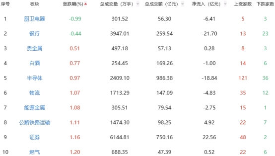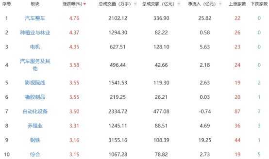 盘面上,汽车整车、种植业与林业、电机等板块涨幅居前,厨卫电器、银行板块下跌。