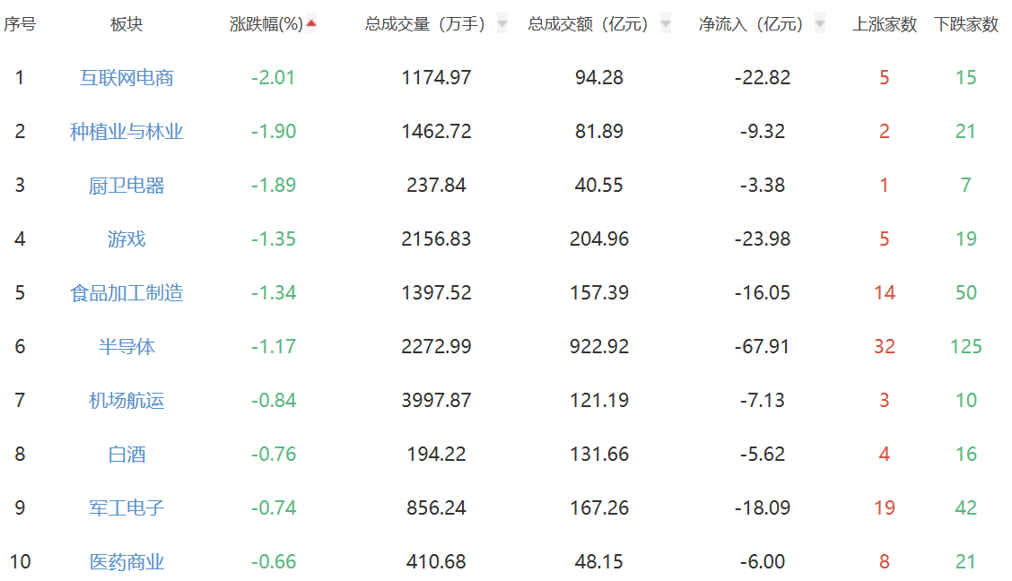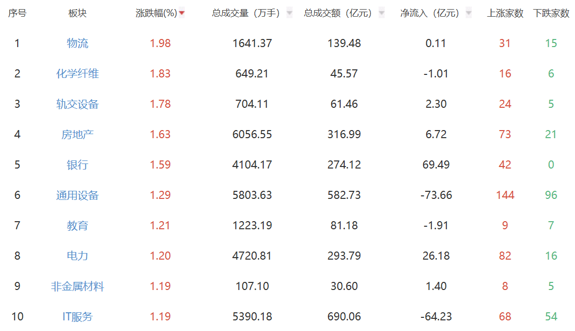 盘面上,物流、化学纤维、轨交设备等板块涨幅居前,互联网电商、种植业与林业、厨卫电器等板块跌幅居前。