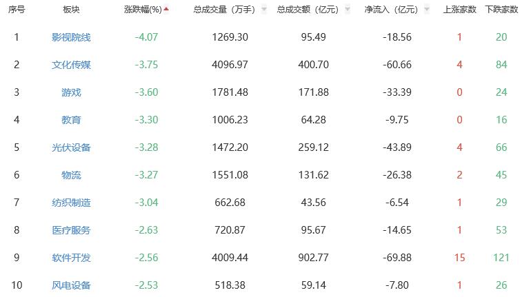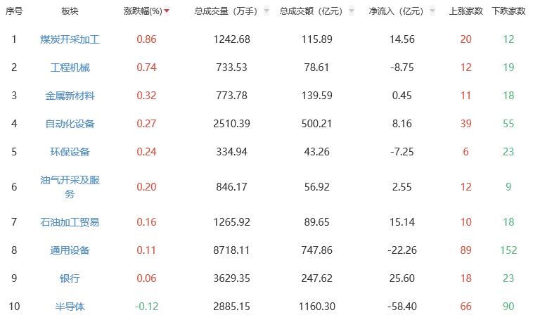 板块方面,煤炭开采加工、工程机械、金属新材料等涨幅居前,影视院线、文化传媒、游戏等跌幅居前。