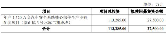 公司本次发行拟募集资金总额不超过27,500.00万元(含),扣除发行费用后的募集资金净额拟用于年产1,520万套汽车安全系统核心部件全产业链配套项目(临山镇3号水库二期地块)。