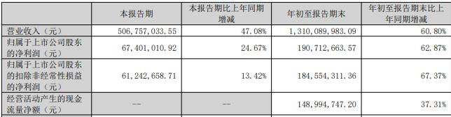 年初至报告期末,公司实现营业收入13.10亿元,同比增长60.80%;归属于上市公司股东的净利润1.91亿元,同比增长62.87%;归属于上市公司股东的扣除非经常性损益的净利润1.85亿元,同比增长增长67.37%;经营活动产生的现金流量净额为1.49亿元,同比增长37.31%。