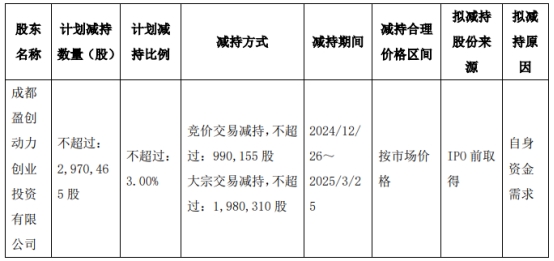 公司于近日收到成都盈创动力创业投资有限公司(以下简称“盈创动力”)送达的《关于减持股份计划的告知函》,因自身资金需求,盈创动力计划自公告披露之日起十五个交易日后的三个月内,通过集中竞价交易方式、大宗交易方式减持公司股份合计不超过2,970,465股,合计减持比例不超过公司总股本的3%。其中,通过集中竞价交易方式减持不超过990,155股,即不超过公司总股本的1%;通过大宗交易方式减持不超过1,980,310股,即不超过公司总股本的2%。
