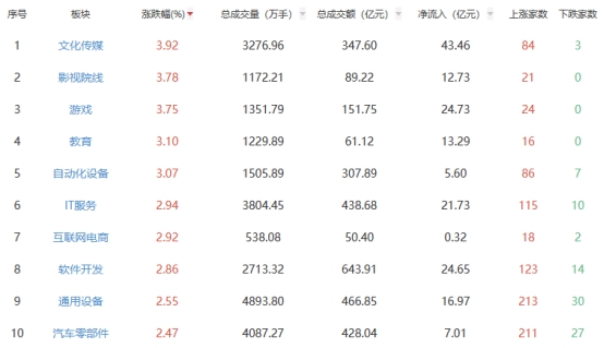 盘面上,文化传媒、影视院线等板块涨幅居前,食品加工制造、贵金属等板块跌幅居前。