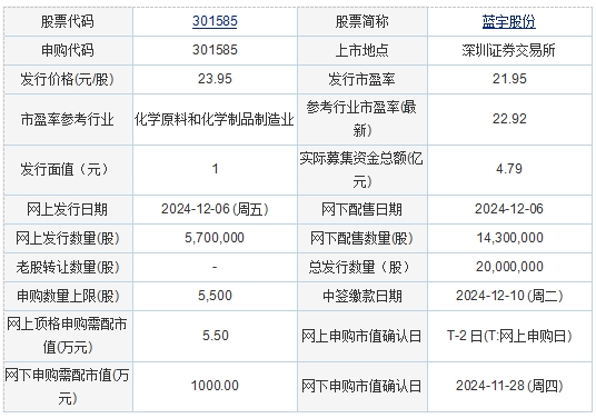 蓝宇股份2024年12月5日披露的首次公开发行股票并在创业板上市发行公告显示,按本次发行价格23.95元/股,公司预计募集资金总额47,900.00万元,扣除预计发行费用约6,278.58万元(不含增值税)后,预计募集资金净额约为41,621.42万元。