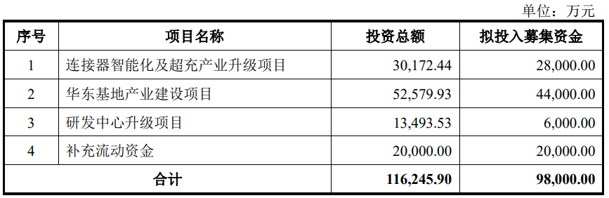 永贵电器2024年11月19日披露的向不特定对象发行可转换公司债券募集说明书(申报稿)显示,公司本次可转债的发行总额不超过人民币98,000.00万元(含本数),扣除发行费用后将用于连接器智能化及超充产业升级项目、华东基地产业建设项目、研发中心升级项目、补充流动资金。
