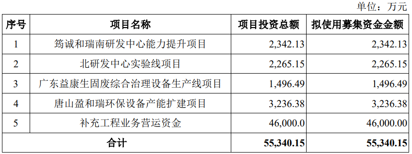 筠诚和瑞原拟在深交所创业板发行不超过12,000万股,不低于15%,不超过25%。筠诚和瑞原拟募集资金55,340.15万元,用于筠诚和瑞南研发中心能力提升项目、北研发中心实验线项目、广东益康生固废综合治理设备生产线项目、唐山盈和瑞环保设备产能扩建项目、补充工程业务营运资金。