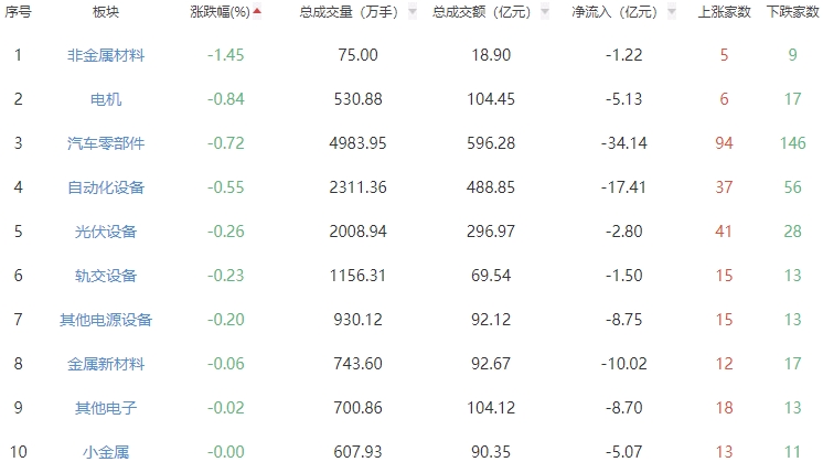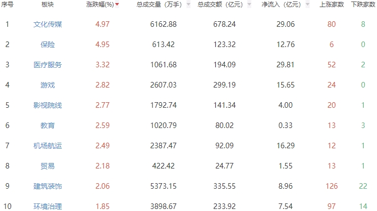 板块方面,文化传媒、保险、医疗服务等板块涨幅居前,非金属材料、电机、汽车零部件等板块跌幅居前。