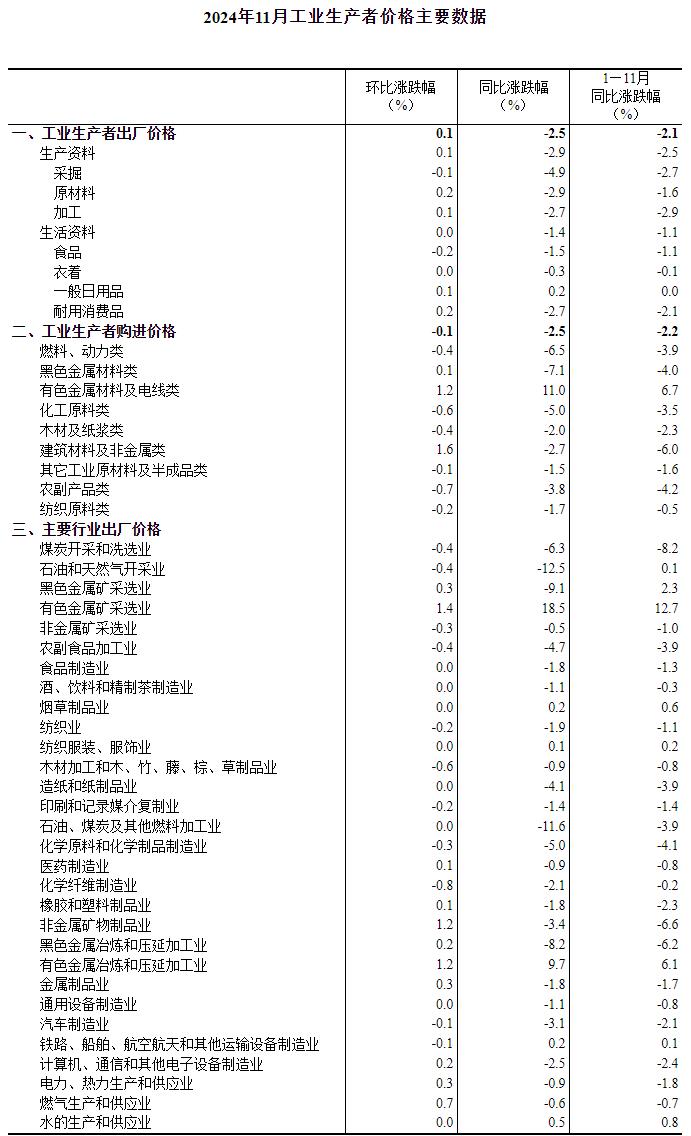 2024年11月份,全国工业生产者出厂价格同比下降2.5%,降幅比上月收窄0.4个百分点,环比由上月下降0.1%转为上涨0.1%;工业生产者购进价格同比下降2.5%,环比下降0.1%。1—11月平均,工业生产者出厂价格比上年同期下降2.1%,工业生产者购进价格下降2.2%。