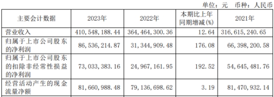 2023年,泛亚微透营业收入为4.11亿元,同比增长12.64%;归属于上市公司股东的净利润0.87亿元,同比增长176.08%;归属于上市公司股东的扣除非经常性损益的净利润0.73亿元,同比增长192.52%;经营活动产生的现金流量净额0.82亿元,同比增长3.19%。