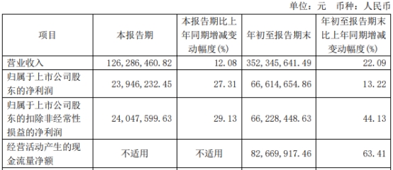 2024年前三季度,泛亚微透营业收入为3.52亿元,同比增长22.09%;归属于上市公司股东的净利润0.67亿元,同比增长13.22%;归属于上市公司股东的扣除非经常性损益的净利润0.66亿元,同比增长44.13%;经营活动产生的现金流量净额0.83亿元,同比增长63.41%。