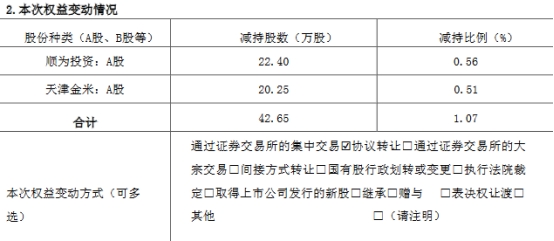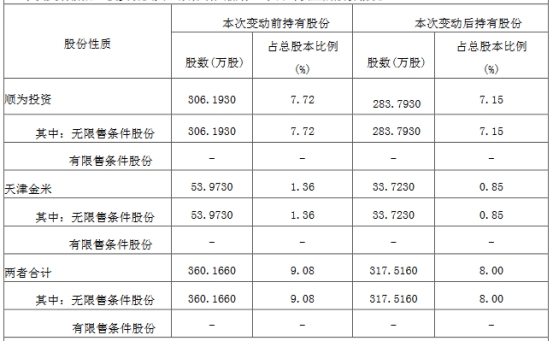 公告显示,顺为投资和天津金米两者合计持有股份数量由360.1660万股降至317.5160万股,持有股份占总股本比例由9.08%降至8.00%。