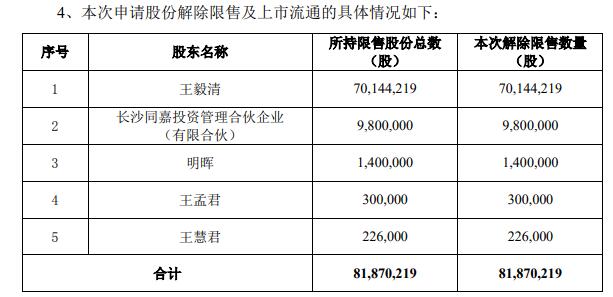 本次申请解除股份限售的股东共计5名,分别为控股股东、实际控制人及董事长王毅清,实际控制人明晖,股东王慧君,股东王孟君,股东长沙同嘉投资管理合伙企业(有限合伙)。