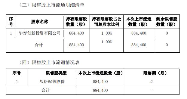 美腾科技公告称,本次上市流通的限售股为公司首次公开发行战略配售限售股,系保荐机构控股股东依法设立的相关子公司华泰创新投资有限公司跟投获配股份,限售期为自公司首次公开发行股票上市之日起24个月。本次上市流通的限售股数量为884,400股,占公司总股本的1.00%,对应限售股股东数量为1名。