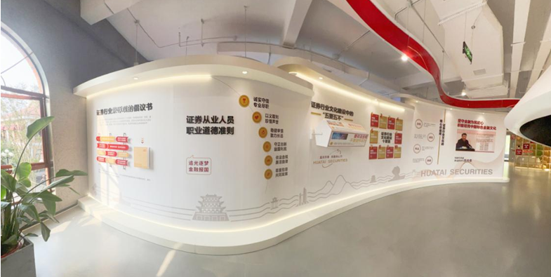 拾步而上,来到二层证券行业文化建设展区。从“合规、诚信、专业、稳健”的证券行业文化理念,到“十个坚持、十个反对”证券行业荣辱观,再到“五要五不”中国特色金融文化,近年来证券行业文化建设成果在这里具象化陈列。展墙设计融入华泰证券“追光者”文化品牌,展现坚守金融为民初心,志与时代共进,争当新时代追光者。