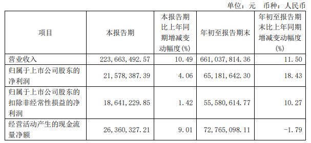 2024年前三季度,雅运股份实现营业收入6.61亿元,同比增长11.50%;归属于上市公司股东的净利润6518.16万元,同比增长18.43%;归属于上市公司股东的扣除非经常性损益的净利润5558.06万元,同比增长10.27%;经营活动产生的现金流量净额为7276.51万元。