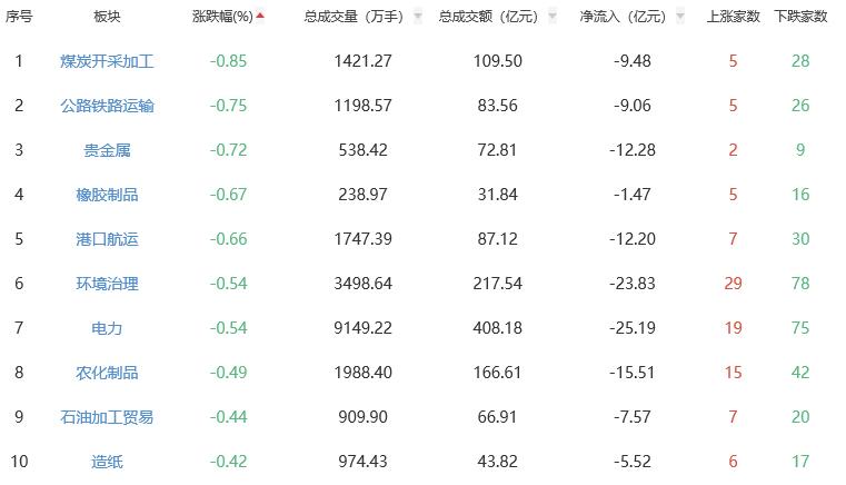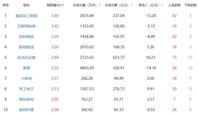 板块方面,食品加工制造、互联网电商、饮料制造、影视院线等涨幅居前,煤炭开采加工、公路铁路运输、贵金属等跌幅居前。