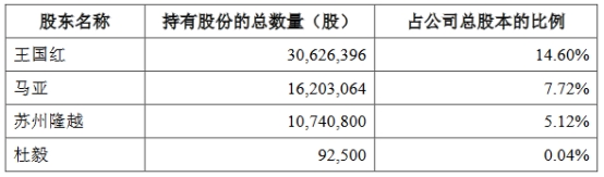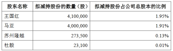 其中,王国红拟减持股份的数量为4,100,000股,拟减持股份占公司总股本的比例为1.95%;马亚拟减持股份的数量为4,000,000股,拟减持股份占公司总股本的比例为1.91%;苏州隆越拟减持股份的数量为273,500股,拟减持股份占公司总股本的比例为0.13%;杜毅拟减持股份的数量为23,100股,拟减持股份占公司总股本的比例为0.01%。