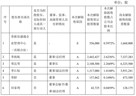 宁新新材本次解除限售的股东包括公司实际控制人李海航、邓达琴、李江标及其一致行动人奉新县盛通企业管理中心(有限合伙),其他解禁股东为公司董事邓婷、董事会秘书/董事/副总经理田家利、财务总监邓聪秀、副总经理刘春根。