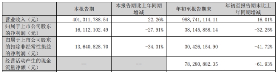 2024年1-9月,南王科技营业收入为9.89亿元,同比增长16.01%;归属于上市公司股东的净利润3814.59万元,同比下降32.25%;归属于上市公司股东的扣除非经常性损益的净利润3042.62万元,同比下降41.72%;经营活动产生的现金流量净额为7828.09万元,同比下降61.93%。