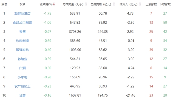 板块方面,半导体、计算机设备、电力等板块涨幅居前,旅游及酒店、食品加工制造、零售等板块跌幅居前。
