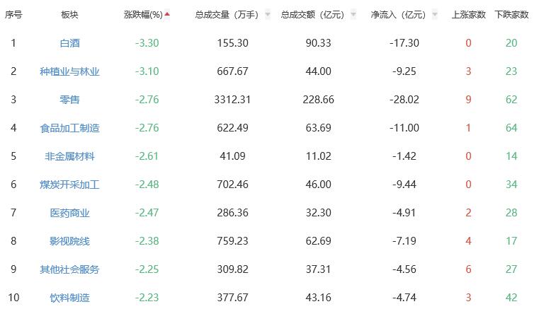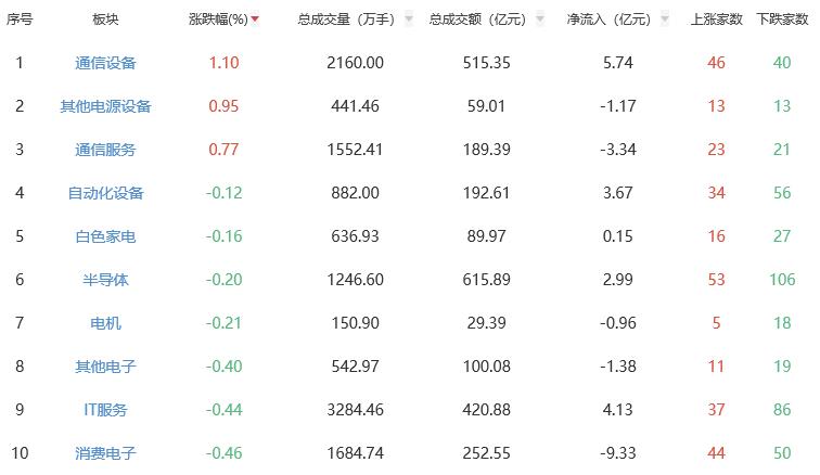 板块方面,通信设备、其他电源设备涨幅居前,白酒、种植业与林业、零售跌幅居前。