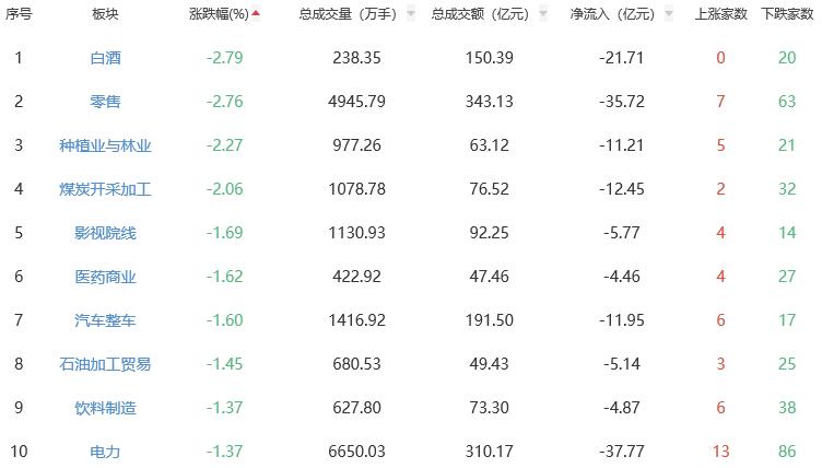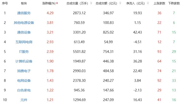 板块方面,通信服务、其他电源设备、通信设备等涨幅居前,白酒、零售、种植业与林业等跌幅居前。