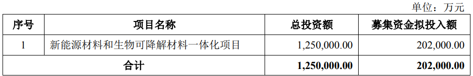 根据联泓新科2024年8月9日披露的向特定对象发行A股股票募集说明书(申报稿)显示,公司拟向特定对象发行股票的发行数量不超过267,113,600股(含本数),未超过本次向特定对象发行股票前公司总股本的20%,且募集资金总额不超过202,000万元(含本数),扣除发行费用后的募集资金净额投入新能源材料和生物可降解材料一体化项目。