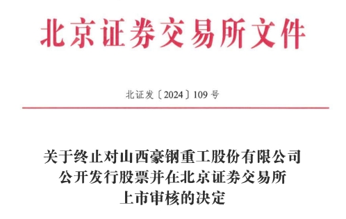 北交所于2023年11月27日受理了豪钢重工提交的公开发行相关申请文件,并按照规定进行了审核。2024年11月25日,豪钢重工向北交所提交了《山西豪钢重工股份有限公司关于撤回公开发行股票并在北交所上市申请文件的申请》,申请撒回申请文件。根据《北京证券交易所向不特定合格投资者公开发行股票并上市审核规则》第五十五条的有关规定,北交所决定终止豪钢重工公开发行股票并在北京证券交易所上市的审核。