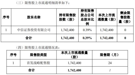 12月16日,杰华特披露《首次公开发行部分战略配售限售股上市流通公告》。本次上市流通的限售股为公司首次公开发行部分战略配售限售股,系公司首次公开发行股票并在科创板上市的保荐机构中信证券股份有限公司全资子公司中信证券投资有限公司跟投获配股份,锁定期为自公司股票上市之日起 24 个月。本次战略配售限售股上市流通数量为1,742,400股,占公司股本总数的0.39%,该部分战略配售限售股将于2024年12月23日起上市流通。