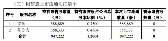 碧兴物联14日发布的首次公开发行部分限售股上市流通公告显示,本次上市流通的限售股为公司首次公开发行的部分限售股,共涉及限售股股东数量为2名,对应的限售股股份数量为947,222股,占公司总股本的1.2064%。限售期为自2021年12月22日起36个月且公司股票上市之日起12个月,现限售期即将届满,该部分限售股将于2024年12月23日起上市流通。