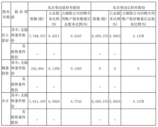 2024年10月25日至2024年12月17日,沃土意好和锡惠投资通过集中竞价交易及大宗交易方式累计减持公司股份1,911,104股,占公司总股本的1.5926%(占剔除公司回购专用账户股份数量后总股本的1.6364%)。