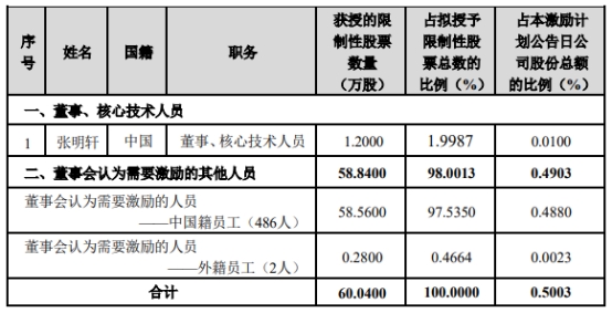 股权激励方式为第一类限制性股票,股份来源于公司自二级市场回购的本公司人民币(A)股普通股股票,授予日为2023年11月22日,授予数量共60.0400万股,占《激励计划(草案)》公告时公司股本总额12,000万股的0.5003%,授予人数共489人,授予价格75.00元/股,限制性股票登记日2023年12月21日。