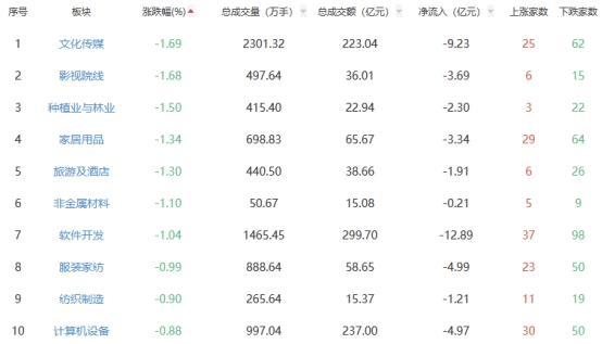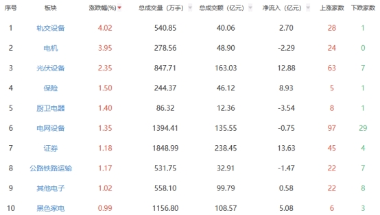 行业板块方面,轨交设备、电机、光伏设备等板块涨幅居前,文化传媒、影视院线、种植业与林业等板块跌幅居前。
