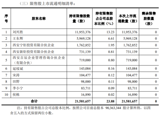 公告称,本次上市流通的限售股为炬光科技首次公开发行限售股,涉及10名股东,解除限售股并申请上市流通股份数量为21,581,657股,占公司当前总股本的23.88%。该部分限售股限售期为自公司首次公开发行股票上市之日起36个月,现锁定期即将届满,将于2024年12月24日起上市流通。