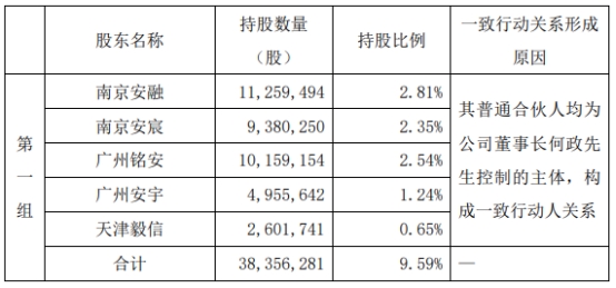 据亚信安全公告,截至公告披露日,公司股东南京安融企业管理合伙企业(有限合伙)(以下简称“南京安融”)持有公司股份11,259,494股,占公司总股本的2.81%;南京安宸企业管理合伙企业(有限合伙)(以下简称“南京安宸”)持有公司股份9,380,250股,占公司总股本的2.35%;广州亚信铭安投资中心(有限合伙)(以下简称“广州铭安”)持有公司股份10,159,154股,占公司总股本的2.54%;广州亚信安宇投资中心(有限合伙)(以下简称“广州安宇”)持有公司股份4,955,642股,占公司总股本的1.24%;天津亚信毅信技术咨询合伙企业(有限合伙)(以下简称“天津毅信”)持有公司股份2,601,741股,占公司总股本的0.65%,上述股东合计持有公司股票38,356,281股,占公司总股本的9.59%。南京安融、南京安宸、广州铭安、广州安宇、天津毅信的普通合伙人均为公司董事长何政控制的主体,为一致行动人。上述股份来源于公司首次公开发行前取得的股份,且已于2023年2月9日解除限售并上市流通。