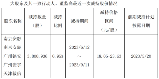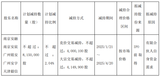 南京安融、南京安宸、广州铭安、广州安宇、天津毅信拟通过集中竞价交易、大宗交易方式减持公司股份数量不超过8,150,000股,即不超过公司总股本的2.04%。其中,通过集中竞价方式减持公司股份合计不超过4,000,100股,即不超过公司总股本的1.00%;通过大宗交易方式减持公司股份合计不超过4,149,900股,即不超过公司总股本的1.04%。减持期限为自本公告披露之日起15个交易日后的3个月内实施。若减持期间公司发生派发红利、送红股、转增股本、增发新股或配股等股本除权、除息事项的,则上述减持计划将作相应调整。