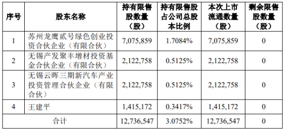 本次解除限售并申请上市流通股份数量为12,736,547股,对应限售股股东共计4 名,占公司股本总数的3.0752%。