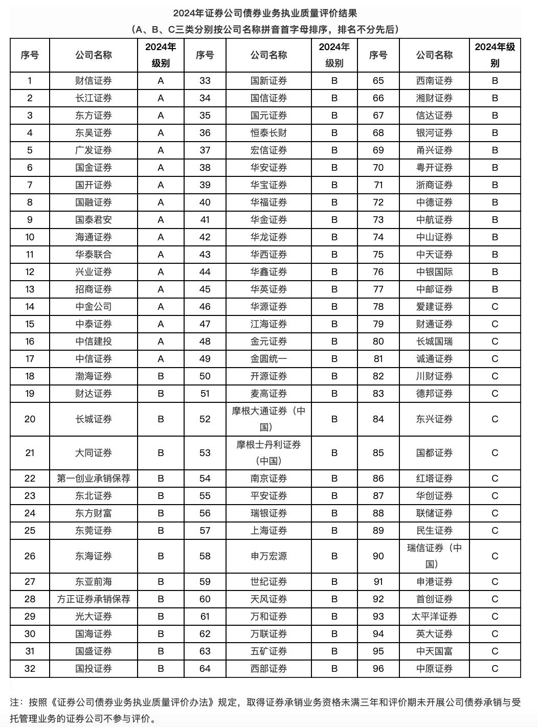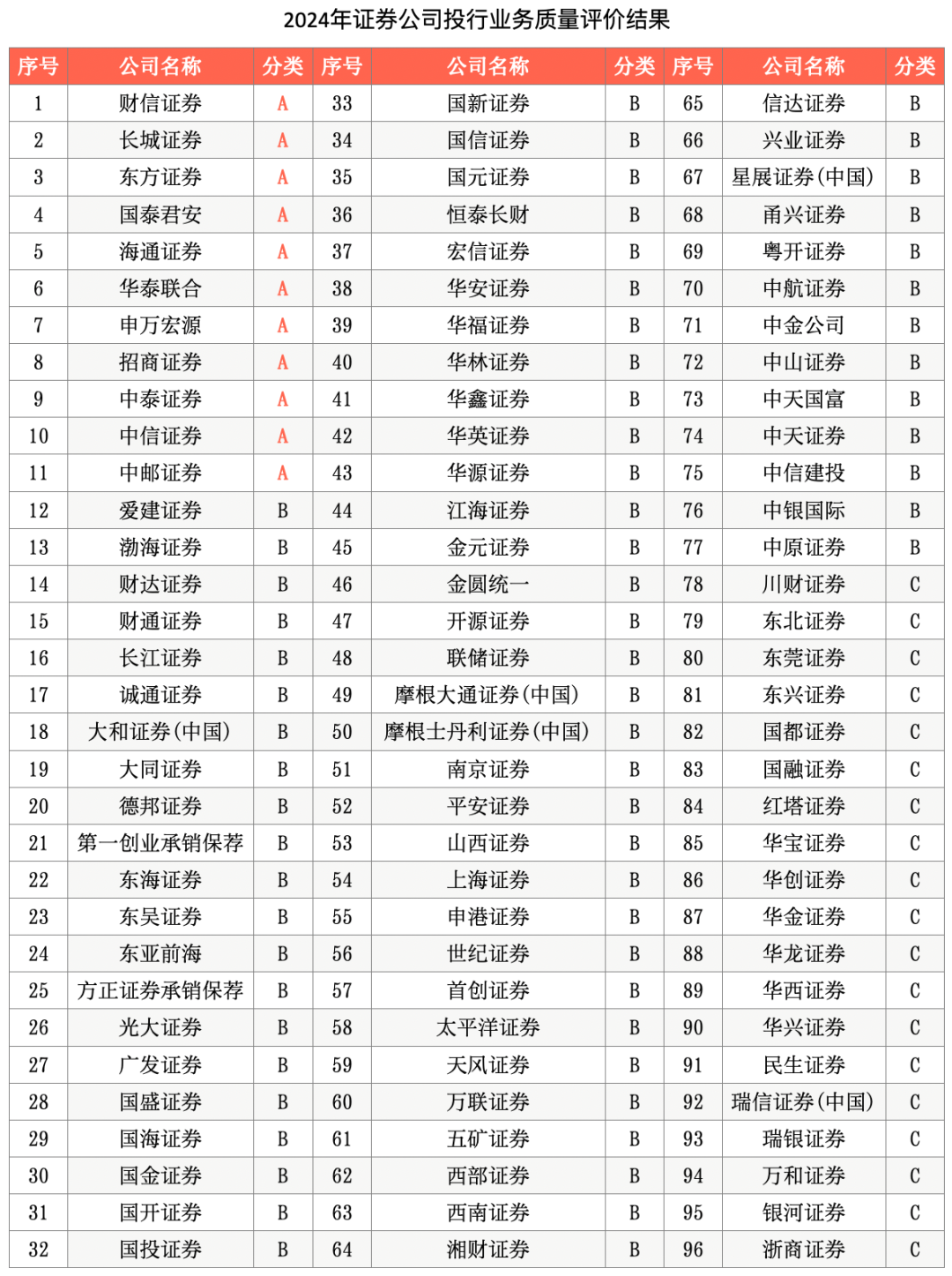 具体来看,A类券商包括财信证券、长城证券(002939)、东方证券、国泰君安(601211)、海通证券(600837)、华泰联合、申万宏源、招商证券(600999)、中泰证券(600918)、中信证券(600030)、中邮证券。与去年的名单相比,2024年A类券商新增了东方证券、国泰君安、海通证券、申万宏源、招商证券、中泰证券、中邮证券。而投行“三中一华”中缺少了中金公司(601995)、中信建投(601066),两家公司本次评价结果均为B类。