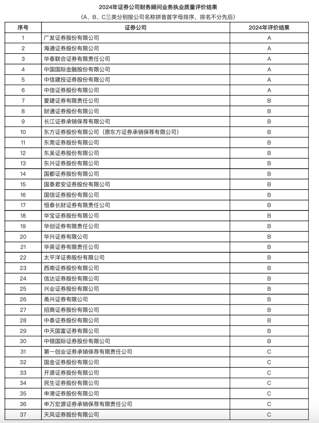 中证协公布2024年证券公司投行、债券及财务顾问业务三项执业质量评价结果