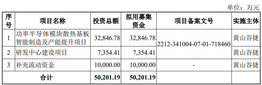 黄山谷捷本次募集资金总额为55,000万元,扣除发行费用后实际募集资金净额为48,128.45万元,公司最终募集资金净额比原计划少2,072.74万元。黄山谷捷2024年12月19日披露的招股书显示,公司拟募集资金50,201.19万元,用于功率半导体模块散热基板智能制造及产能提升项目、研发中心建设项目、补充流动资金。