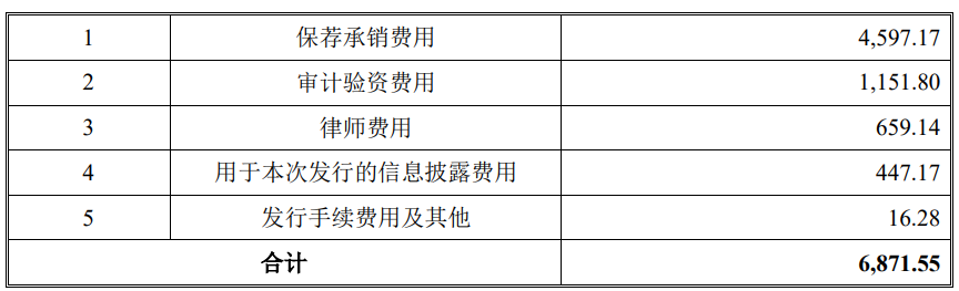 黄山谷捷本次发行费用总额为6,871.55万元,其中保荐承销费用4,597.17万元。