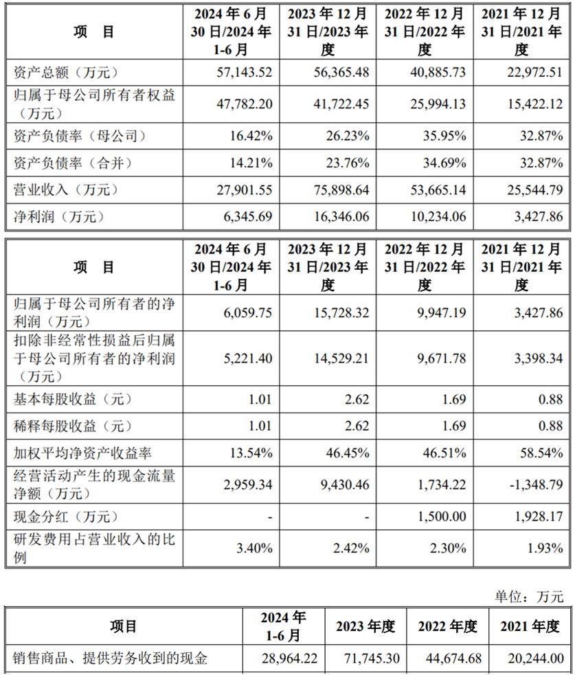 2021年至204年1-6月,黄山谷捷的营业收入分别为25,544.79万元、53,665.14万元、75,898.64万元和27,901.55万元;净利润分别为3,427.86万元、10,234.06万元、16,346.06万元和6,345.69万元;归属于母公司所有者的净利润分别为3,427.86万元、9,947.19万元、15,728.32万元和6,059.75万元;扣除非经常性损益后归属于母公司所有者的净利润分别为3,398.34万元、9,671.78万元、14,529.21万元和5,221.40万元。