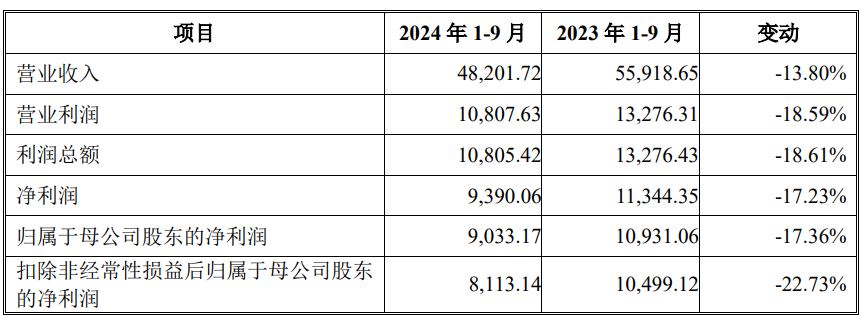 2024年1-9月公司营业收入为48,201.72万元,同比下降13.80%;净利润9,390.06万元,同比下降17.23%;归属于母公司股东的净利润9,033.17万元,同比下降17.36%;扣除非经常性损益后归属于母公司股东的净利润为8,113.14万元,同比下降22.73%。