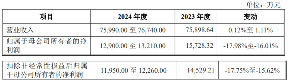 黄山谷捷根据实际经营情况和在手订单,测算预计2024年度营业收入为75,990.00万元至76,740.00万元,较2023年度同比上涨0.12%至1.11%;归属于母公司所有者的净利润为12,900.00至13,210.00万元,同比下降17.98%至16.01%;扣除非经常性损益后归属于母公司所有者的净利润为11,950.00万元至12,260.00万元,同比下降17.75%至15.62%。