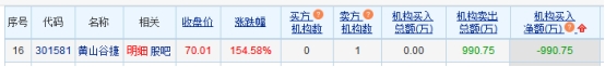 黄山谷捷龙虎榜:1家机构进卖出前5 净卖出共991万元