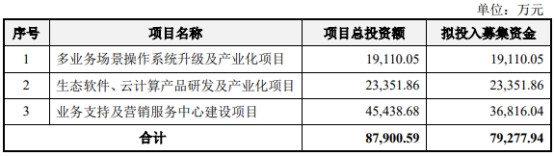 凝思软件原拟在创业板募资79,277.94万元,用于“多业务场景操作系统升级及产业化项目”“生态软件、云计算产品研发及产业化项目”“业务支持及营销服务中心建设项目”。