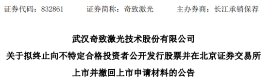 中国经济网北京1月6日讯 武汉奇致激光技术股份有限公司(以下简称“奇致激光”,832861)近日披露了关于拟终止向不特定合格投资者公开发行股票并在北京证券交易所上市并撤回上市申请材料的公告。