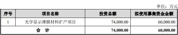 本次发行的募集资金总额不超过人民币60,000.00万元(含本数),扣除发行费用后拟用于光学显示薄膜材料扩产项目。