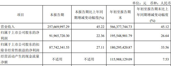 年初至报告期末,公司实现营业收入5.66亿元,同比增长45.12%;归属于上市公司股东的净利润1.96亿元,同比增长26.64%;归属于上市公司股东的扣除非经常性损益的净利润1.80亿元,同比增长33.56%;经营活动产生的现金流量净额为1.16亿元,同比增长7.53%。