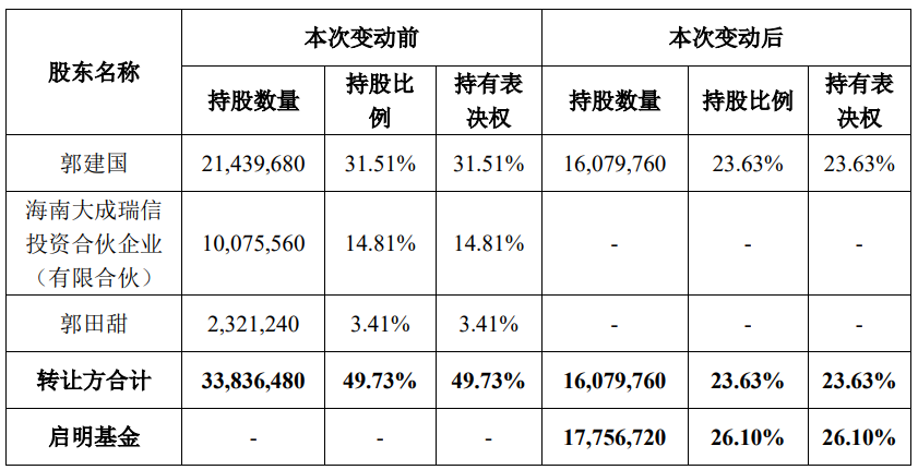 2025年1月6日,公司控股股东郭建国及其一致行动人郭田甜、海南大成瑞信投资合伙企业(有限合伙)(以下合称“转让方”),与苏州工业园区启瀚创业投资合伙企业(有限合伙)(以下简称“苏州启瀚”、“受让方”)正式签署《股份转让协议》,苏州启瀚作为普通合伙人暨执行事务合伙人拟设立的并购基金(以下简称“启明基金”)拟协议收购转让方持有的合计17,756,720股天迈科技股份,占上市公司股份总数的26.10%。